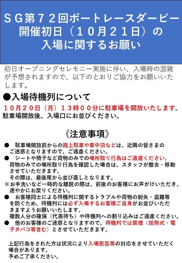 SG第72回ボートレースダービー開催初日(10月21日)の入場に関するお願い