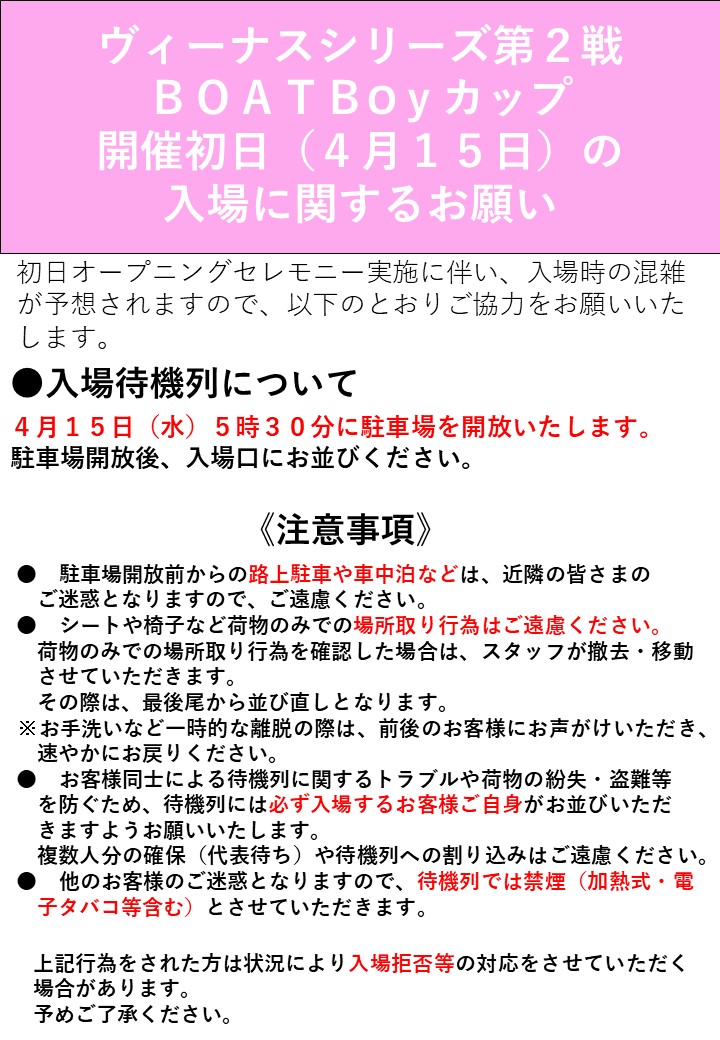 ヴィーナスシリーズ第2戦BOATBoyカップ開催初日(4月15日)の入場に関するお願い