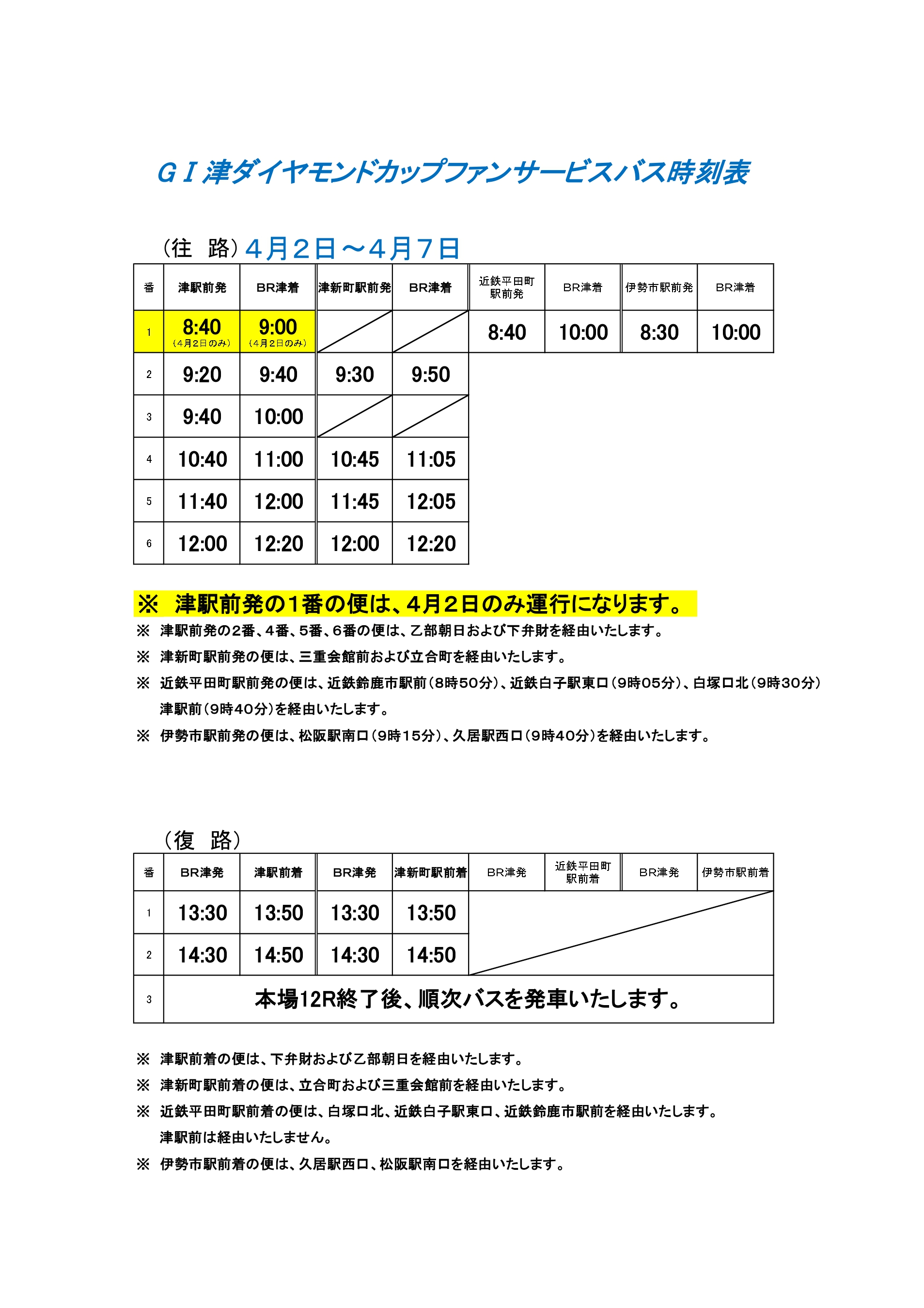 「GⅠ津ダイヤモンドカップ」開催時4月2日(木)~7日(火)において下記の通りファンサービスバスの運行を行います。