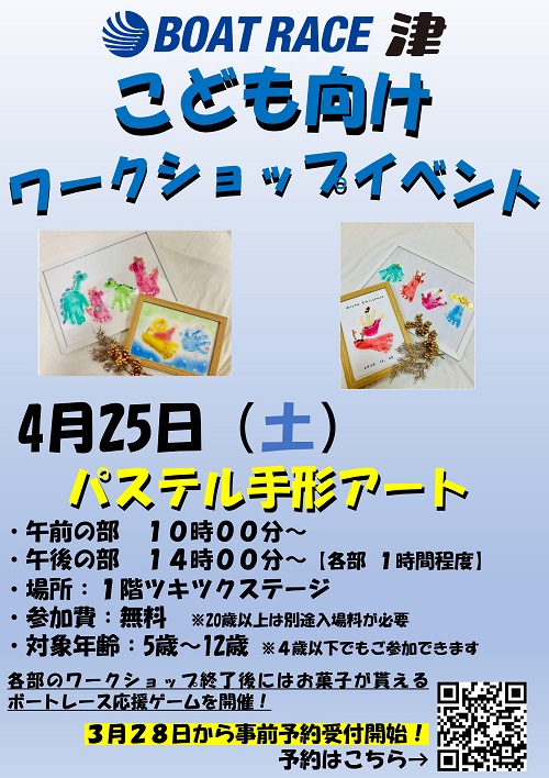 子ども向けワークショップイベントを年間で開催!親子で来場して、ボートレース津でイベントを楽しもう!第1回はパステル手形アート体験を開催します。